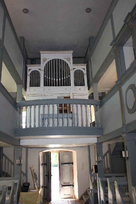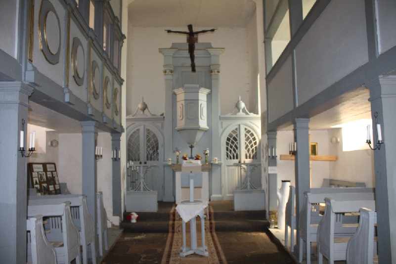ein Kanzelaltar, die Empore links die Patronatsloge. Die im